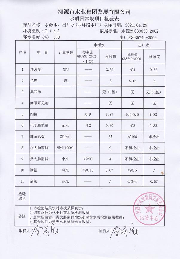 2021年4月29日水質(zhì)檢驗報告