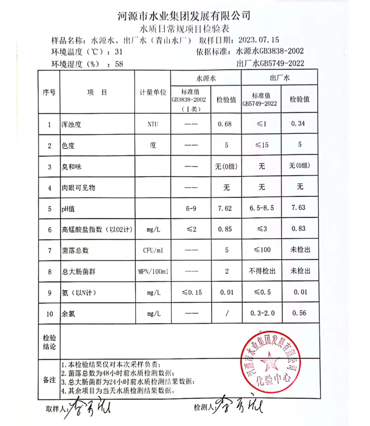 2023年7月15日水質(zhì)檢驗(yàn)報(bào)告